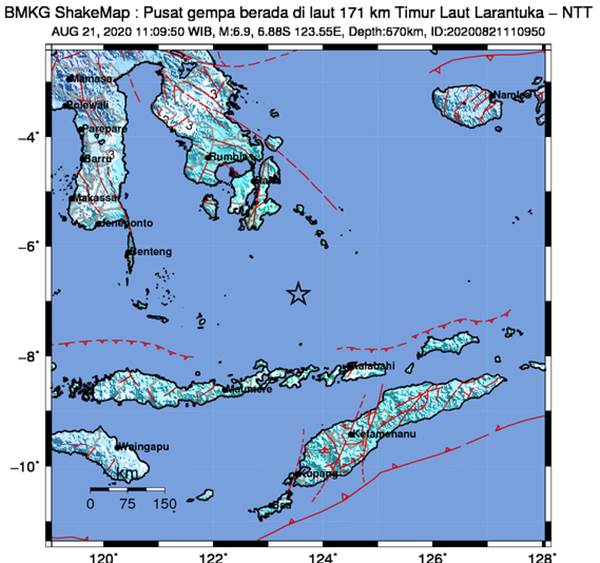 Badan Meteorologi Klimatologi dan Geofisika (BMKG) merilis parameter gempa bumi pada Jumat (21/8), pukul 11.09 WIB di wilayah Laut Banda. Gempa tektonik dengan magnitudo M6,9 berlokasi di laut pada jarak 165 km tenggara Buton, Selatan Sulawesi Tenggara pada kedalaman 586 km. BMKG menginformasikan berdasarkan hasil pemodelan menunjukkan bahwa gempa bumi ini tidak berpotensi tsunami.