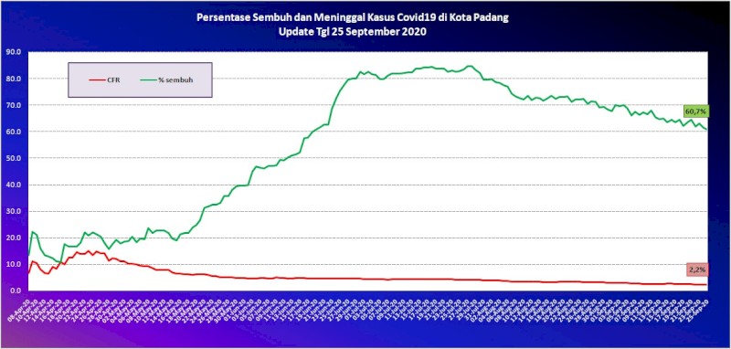 Sisa kasus konfirmasi sampai dengan tanggal 25 September 2020 adalah 969 kasus, 389 kasus diantaranya adalah kasus konfirmasi bergejala (144 kasus dirawat, 245 kasus isolasi) dan 580 kasus merupakan kasus konfirmasi tanpa gejala (28 dirawat dan 552 kasus isolasi).