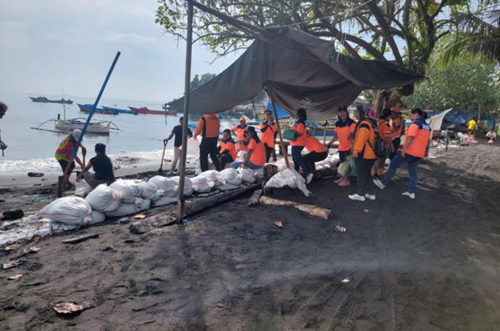 Pembuatan tanggul penahan banjir rob darurat dari kantong berisi pasir oleh tim BPBD Kabupaten Halmahera Utara bersama TNI dan instansi terkait di Desa Wosia, Kecamatan Tobelo Tengah, Kabupaten Halmahera Utara, Kamis (19/1). (BPBD Kabupaten Talaud)